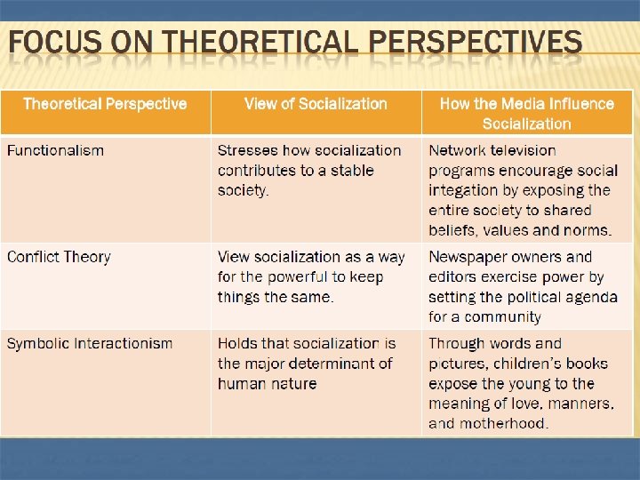 Symbolic Interactionism and Socialization n How does symbolic interactionism help us understand socialization? n n n The self-concept (an image of yourself as having an identity separate from other people) The looking-glass self (an image of yourself based on what you believe others think of you) Significant others (those people whose reactions are most important to you) Role taking (assuming the viewpoint of another person and using that viewpoint to shape the self concept) Imitation Stage n n Play stage n n Mead’s second stage in the development of role taking, children act in ways they imagine other people would Game stage n n Mead’s first stage in the development of role taking, children begin to imitate behaviors without understanding why Mead’s third stage in the development of role taking, children anticipate the actions of others based on social rules The generalized other (integrated conception of the norms, values, and beliefs of one’s community or society)