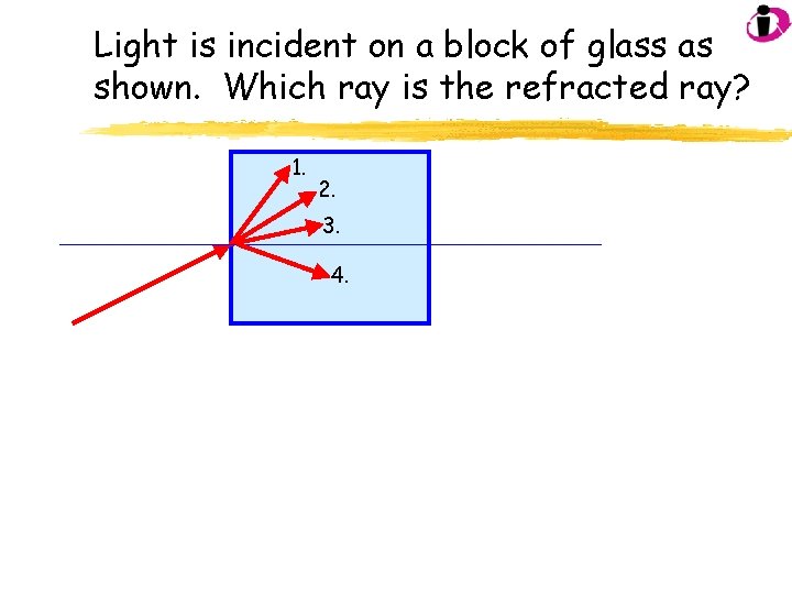 Light is incident on a block of glass as shown. Which ray is the refracted ray? 1. 2. 3. 4.