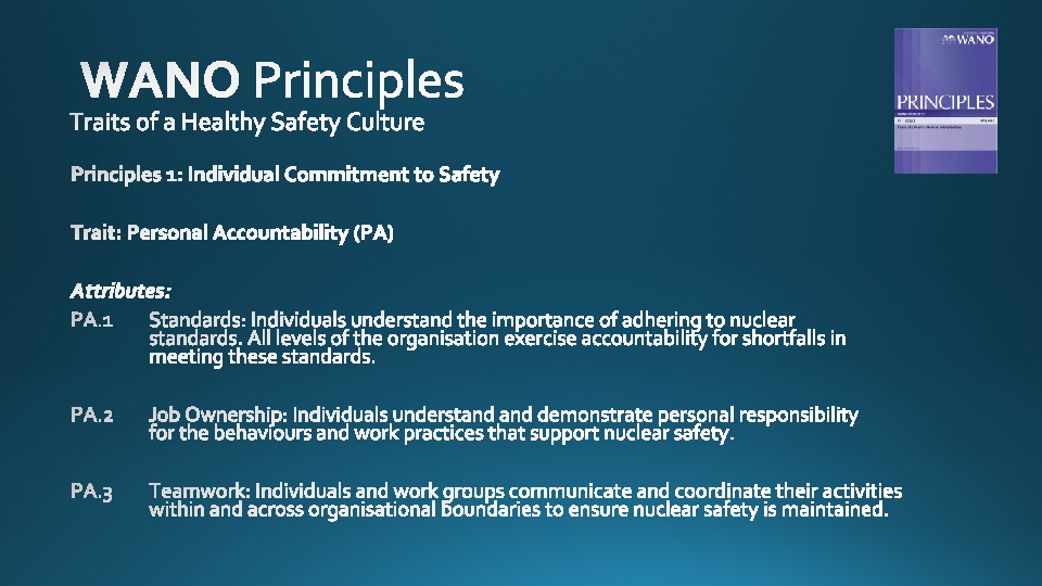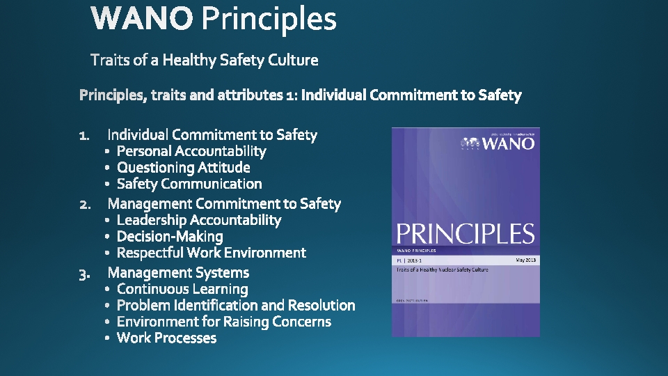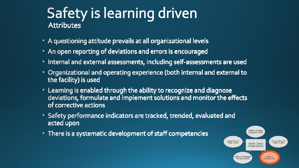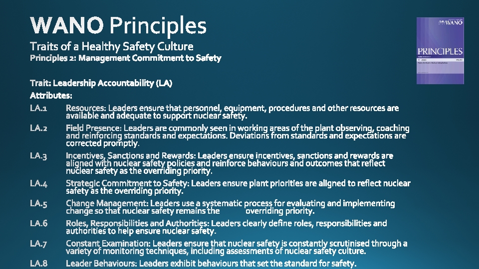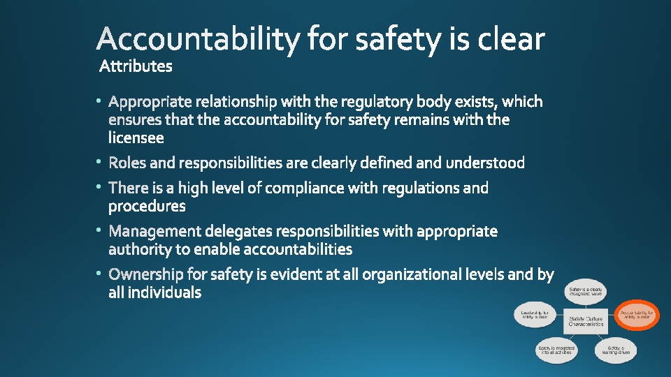 Requirements on: • Responsibility for Safety • Leadership for Safety • Management for Safety • Culture for Safety • Measurement, Assessment and Improvement