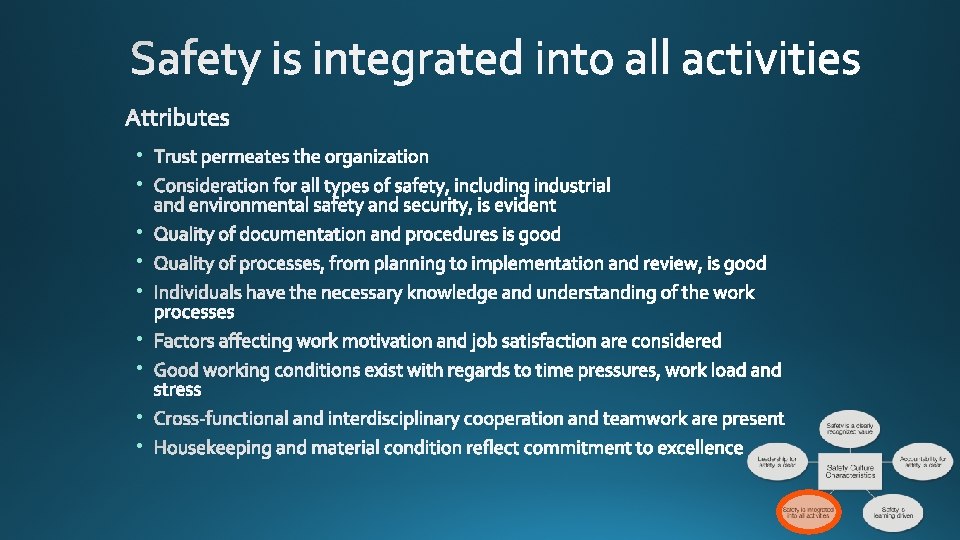 Structure: The systems, frameworks, infrastructure created to ensure a systematic approach to safety Progression: The enactment based on organizational learnings and evolved understandings Interrelationships: What happens between people, groups and organizations that shapes behaviours