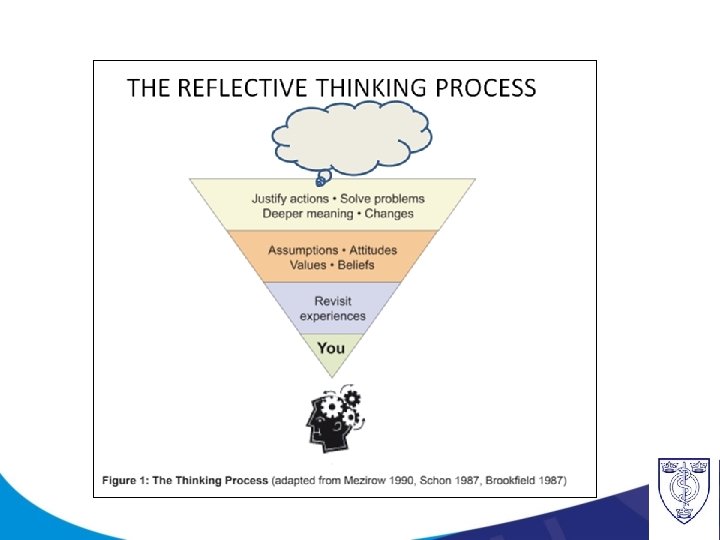 What is reflective thinking? • Reflective thinking process starts with you • Before you can begin to assess the words and ideas of others, you need to pause and identify and examine your own ‘baseline’ position • This involves revisiting your prior experience and knowledge of the topic you are exploring & involves considering how and why you think the way you do • The examination of your beliefs, values, attitudes and assumptions forms the foundation of your interpretation of a new events and ultimately building a richer understanding and new learning • You recognise and define the valuable knowledge you bring to every new experience • The learning process fundamentally relies on the important connections between what you already know and how you place that in the context of new events. In this way, you become an active, aware and critical learner