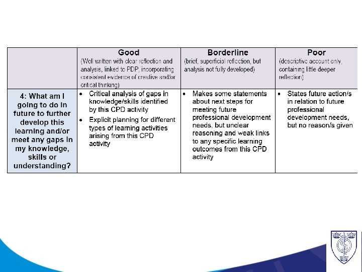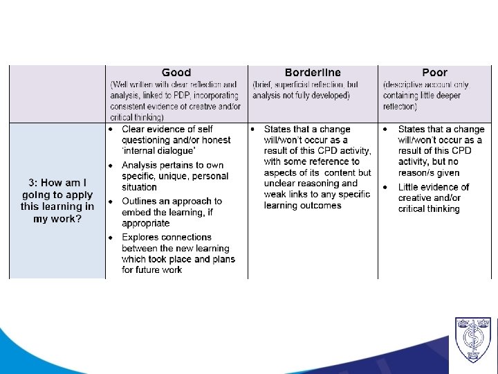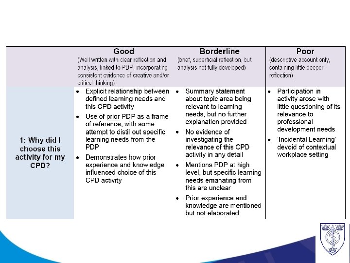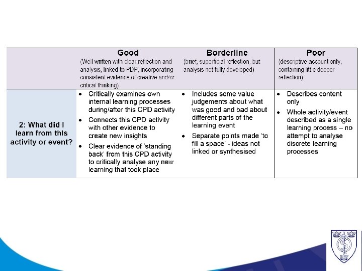 Audit thresholds • • Submission must be personally identifiable There must be a PDP(s) covering the relevant CPD year Must be at least 50 credits (up to 100 assessed) All credits supported by a reflective note No more than 5 credits per reflective note A minimum of 25 credits directly related to PDP Balance type of activities – One type of activity not more than half of claimed credits