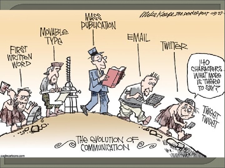 Communication Timeline � 3000 B. C. - the Egyptians created hieroglyphics � 776 BC - homing pigeons used to send message � 105 A. D. - paper and ink � 1665 A. D. - the first English newspaper � 1828 A. D. – the dictionary � 1844 A. D. – the Morse code � 1876 A. D. - Alexander Graham Bell invented the telephone � 1919 A. D. - first radio broadcast � 1936 A. D. – first television broadcast made in London, England