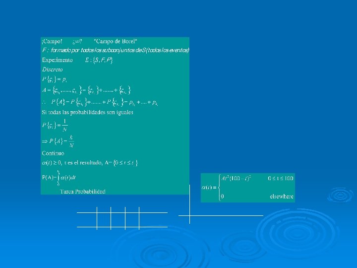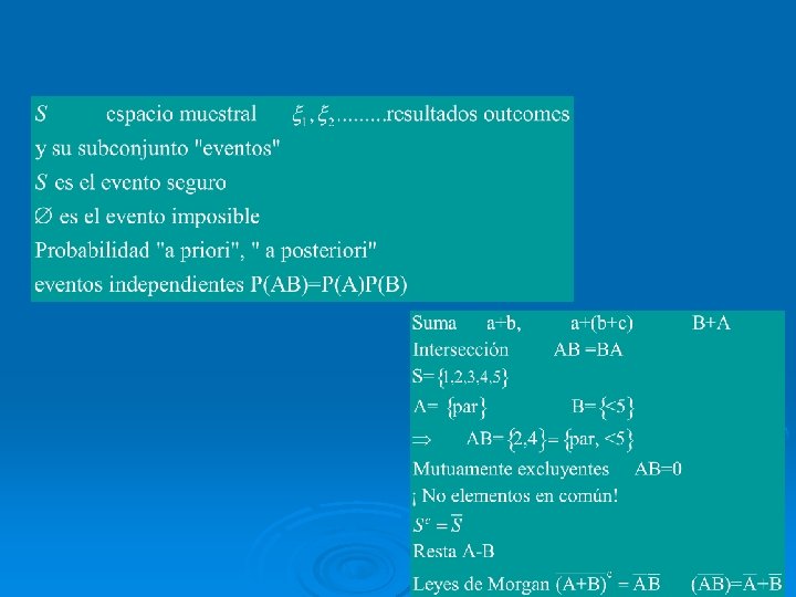 Definiciones Ø Set Ø Event Ø Universal Set Ø Sample Space, Trial Ø Element Ø Outcome Ø Complete Set Ø Event Space o CAMPO? campo de Borel