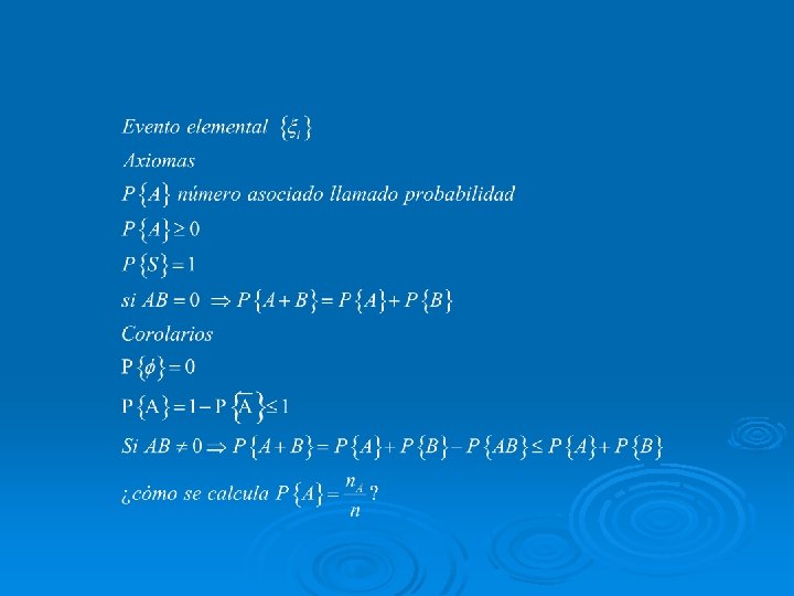 Definiciones Ø Ø Ø Certeza Variabilidad Azar (chance, likely) Credibilidad Regularidad Axioma Aleatorio (random) Probabilidad Estadística A priori A posterior Experiment Ø Trial Ø Outcome Ø Event Ø Sample Space Ø Eventos independientes Ø Probabilidad condicionada Ø