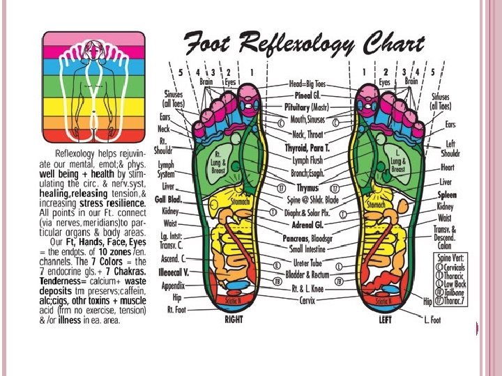 REFLEXOLOGY REFERRAL AREAS FOR SPECIFIC CONDITIONS Reminder: “Do not diagnose, prescribe or claim to treat specific conditions” Constipation- liver, gallbladder, diaphragm, adrenals, lower spine, sigmoid, illeocecal Diarrhea- ascending colon, transverse colon, diaphragm, liver, adrenals Insomnia- diaphragm, call glands Edema- lymph system, kidneys, adrenals Tinnitus- ear reflex, cervical, neck , great toe Headache- whole spine, diaphragm, all glands, toes Cramps- hip/knee, sciatic, lower spine, parathyroid, adrenals Sprain- specific area, referral area