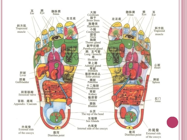 REFLEXES 15 -31 24. 25. 26. 27. 28. 29. 30. 31. 24. Ribs/ upper back- Diaphragm to neckline between metatarsals down to waistline 25. Breast- diaphragm to neckline, between zones 3 -4 26. Liver- Waistline to diaphragm, zones -4 right, zone 1 left 27. Gall bladder- halfway between waistline and diaphragm, zone 4 right 28. Adrenal- waistline 1/3 to diaphragm, zones 1 left, zone 1 right 29. Stomach- waistline to diaphragm, zones 1 -4 left, zone 1 right 30. Spleen- proximal to diaphragm, between zones 4 -5, left 31. Pancreas- waistline halfway to diaphragm, zones 1 -4 left, waistline