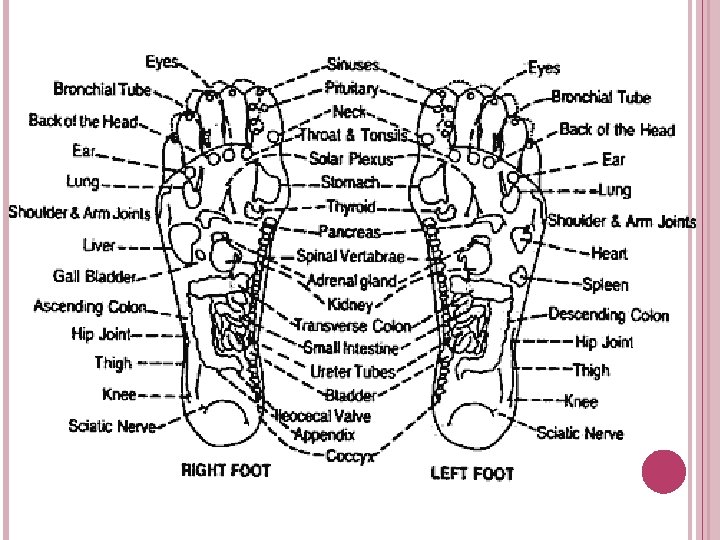 REFLEXOLOGY ON THE SPINE Spine- medial aspect of foot � Cervical- base of big toenail to below joint � Thoracic- below joint to waist � Lumbar- waist to heel � Sacrum- below heel � Coccyx- middle heel
