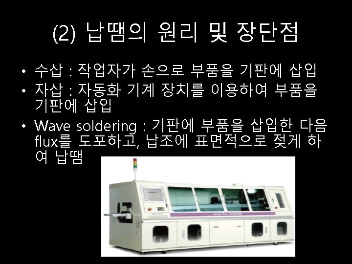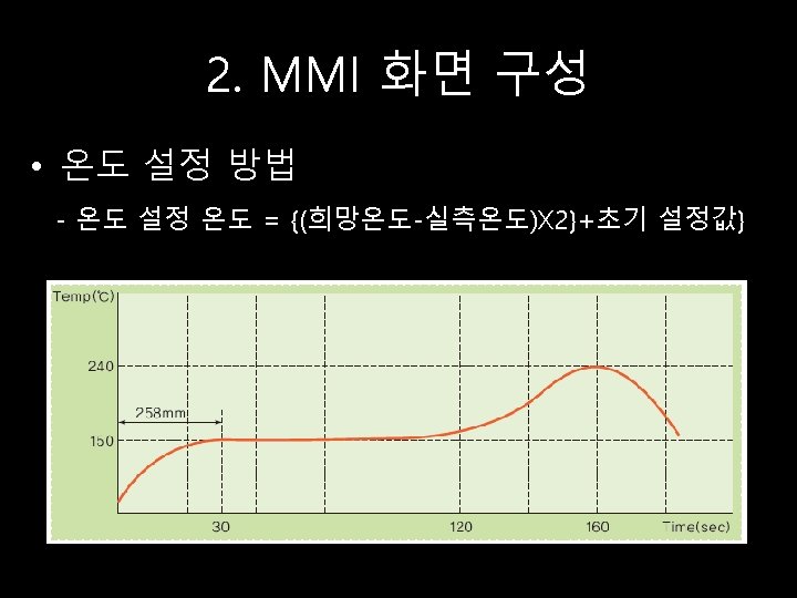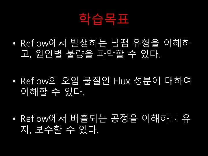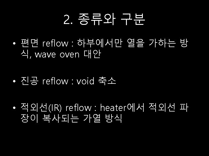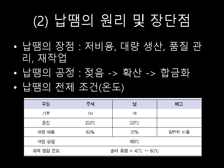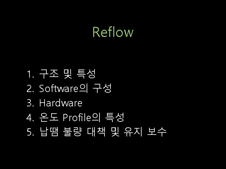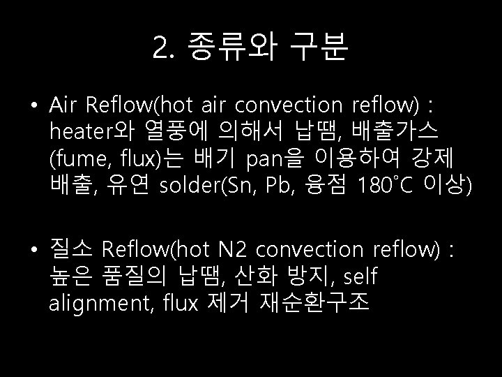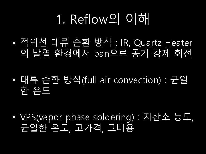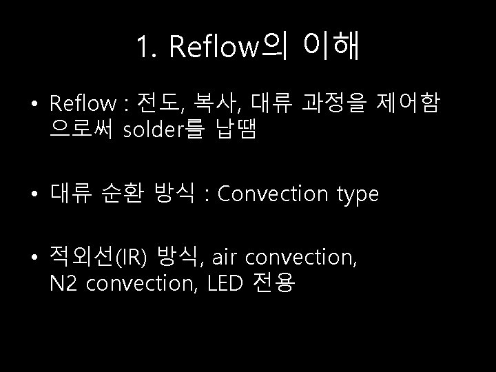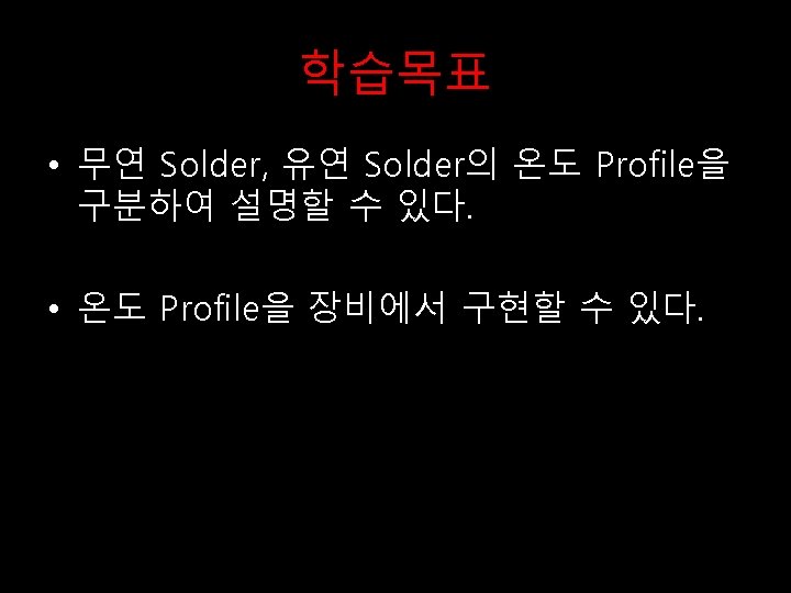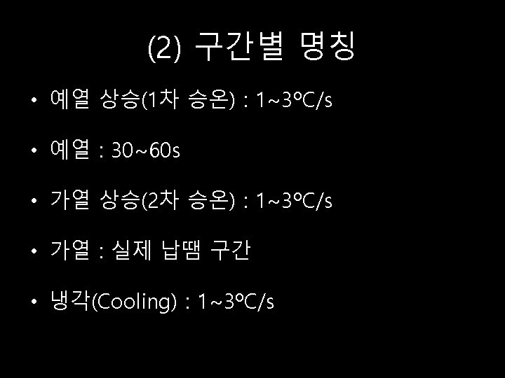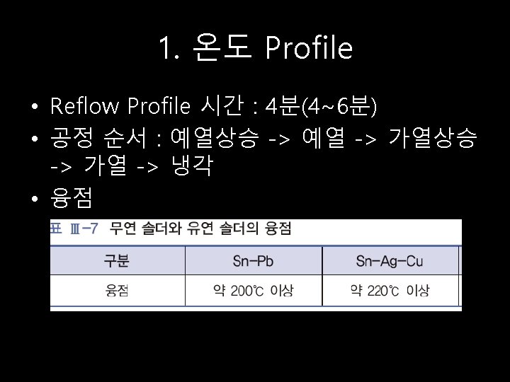 (3) 유연 Solder • 융점 : 183ºC • 승온(용융 기화) Zone : 25~150ºC 동안 2~3ºC/s • Pre Heating Zone : 150~180ºC 동안 90~120 s • Reflow(Hole Time, Melting Time) Zone : 200ºC 이상 20~40 s, Peak 온도 230ºC • Cooling Zone(Slope, 냉각) : Melting Slope와 동일