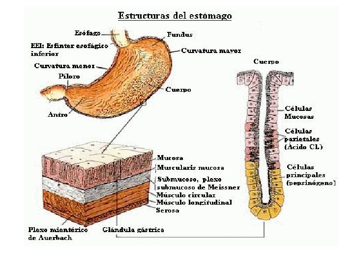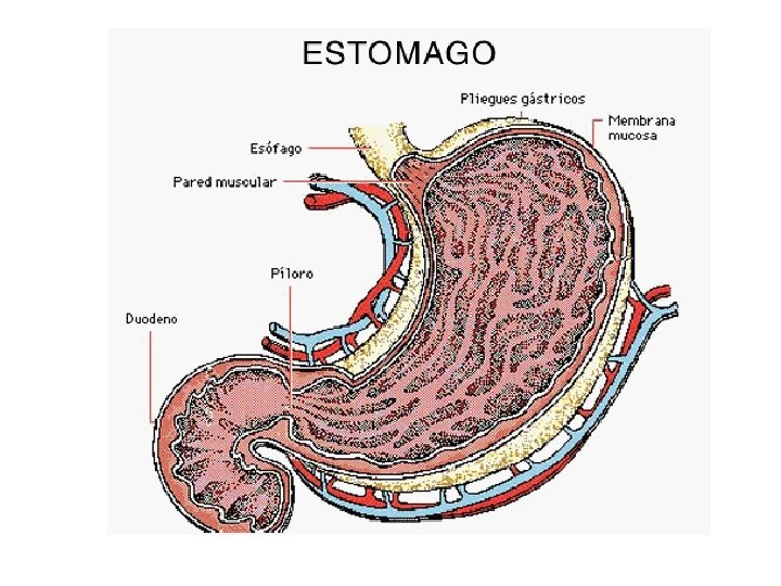 * Características: - Porción más dilatada del tubo digestivo. - Externamente está cubierto por el peritoneo visceral. - Puede llegar a almacenar 2 L. de alimento. - Sus paredes presentan fibras musculares lisas, oblicuas, longitudinales y circulares. - En su interior no es liso, más bien presenta arrugas y pliegues. - Es tapizado por una túnica mucosa en donde se encuentran las glándulas que segregan el jugo gástrico.