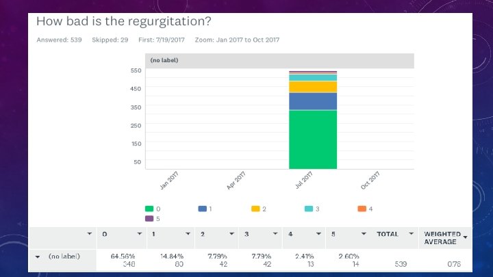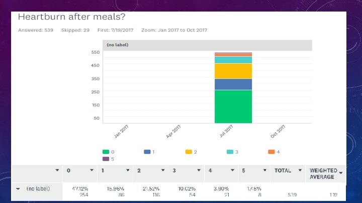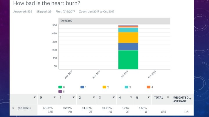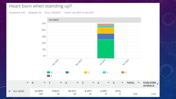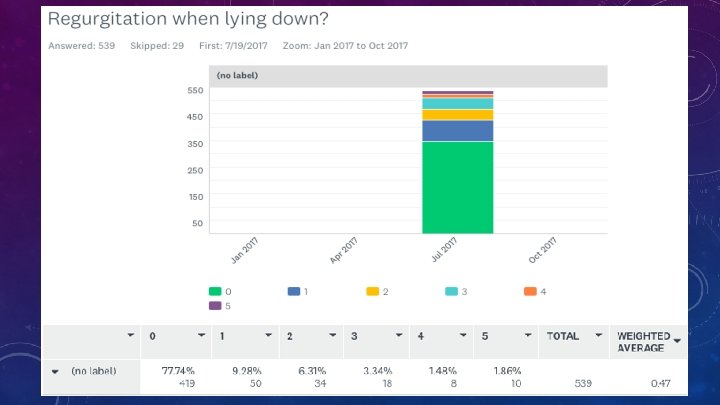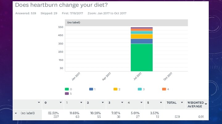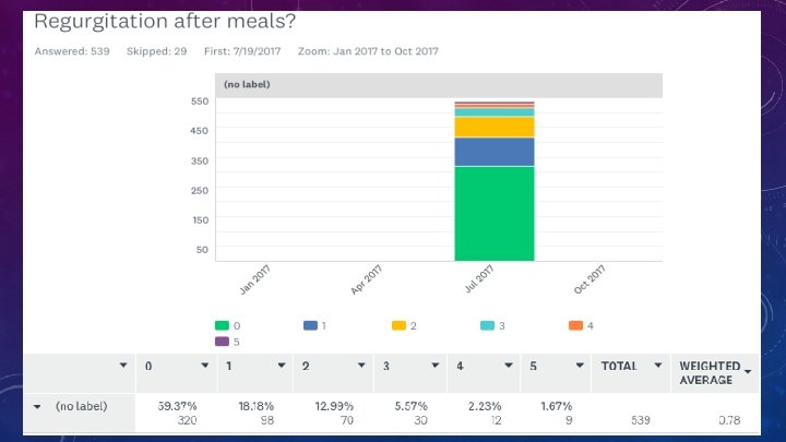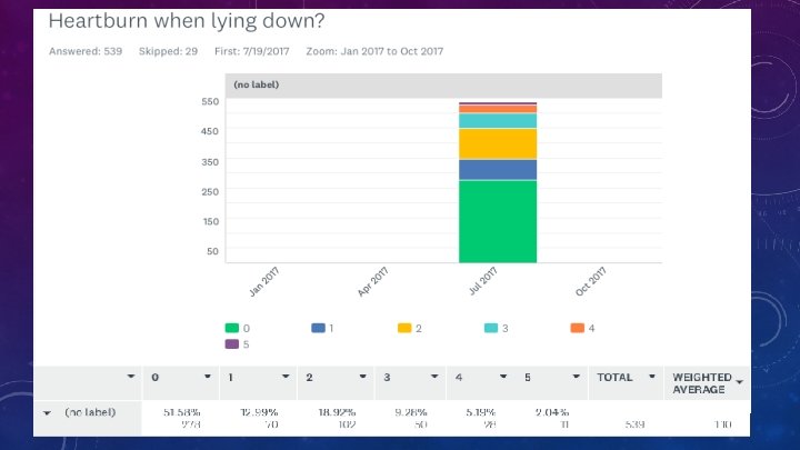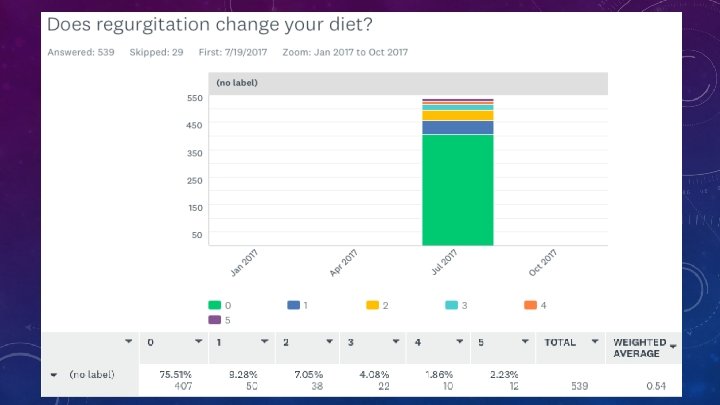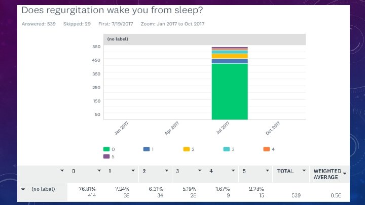 POST SLEEVE GASTRECTOMY REFLUX SYMPTOMS • Ongoing prospective research is being conducted to investigate the symptoms of all patients underwent laparoscopic sleeve gastrectomy. • Of the 1500 patients identified to have undergone sleeve gastrectomy at Circle of Care between 2011 and 2016, 568 patients have -to-this-date- responded to the questionnaire.
