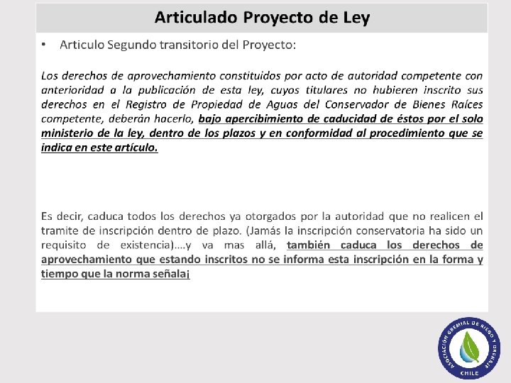 Otra normativa del Proyecto: • Permite suspender el ejercicio de los derechos consuntivos permanentes y continuos, otorgados con posterioridad a la declaración de cuenca agotada. (5° transitorio del proyecto). • Extingue derechos ya otorgados que no hayan construido las obras para extraer. (129 bis del proyecto). • Prohíbe el cambio de uso del derecho.