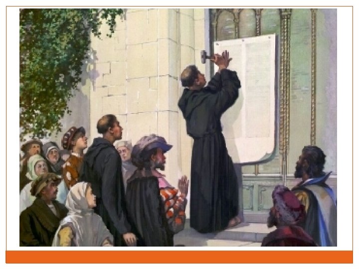 Martin Luther 1483 -1546 • Seorang biarawan Jerman • Pemikiran : meragukan kekuasaan gereja untuk memberikan • • keselamatan Ketika membaca al-Kitab ia mendapatkan jawaban bahwa Konsep Keselamatan hanya melalui iman. Iman yang diberikan secara gratis oleh Tuhan melalui Kristus. Tahun 1517, Titik Tolak Reformasi terhadap praktik gereja menjual surat pengampunan dosa untuk Penyucian diri. Seolah orang bisa membeli tiket masuk ke surga. Luther menempelkan 95 dalil di pintu gereja Kastil Wittenberg. Luther kemudian mendesak gereja untuk mengadakan pembaharuan.