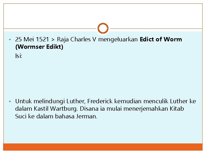 • 25 Mei 1521 > Raja Charles V mengeluarkan Edict of Worm (Wormser Edikt) Isi: • Untuk melindungi Luther, Frederick kemudian menculik Luther ke dalam Kastil Wartburg. Disana ia mulai menerjemahkan Kitab Suci ke dalam bahasa Jerman.