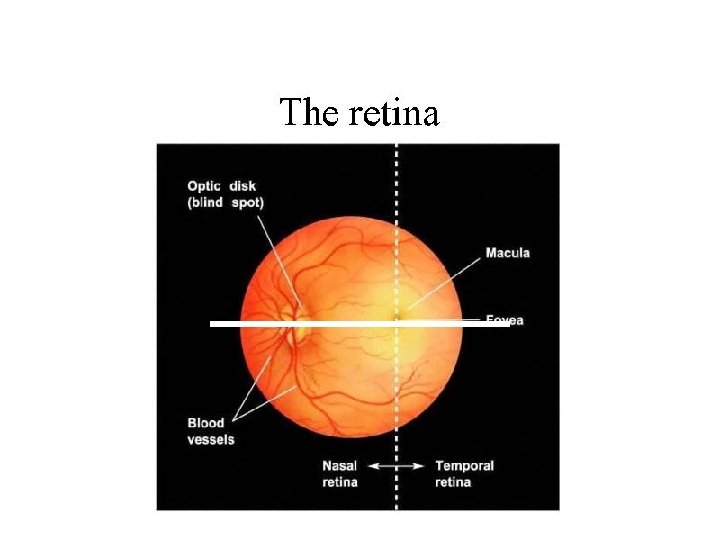 The Retina • Photoreceptors – Rods – Cones • Bipolar cells • Ganglion Cells – axons converge at optic disk – axons constitute optic nerve • Horizontal cells • Amacrine cells