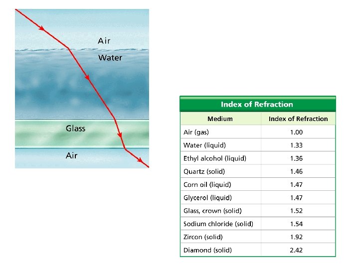 Refraction of Light • When light rays enter a medium at an angle, the change in speed causes the rays to bend, or change direction • Some mediums cause light to bend more than others • A material’s index of refraction is a measure of how much a ray of light bends when it enters that material – Higher the index the more it bends