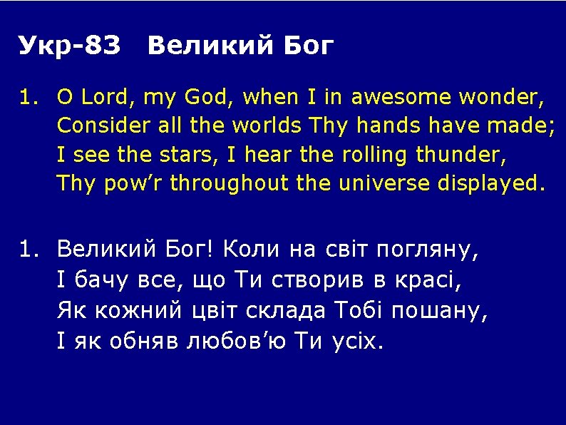2. When through the woods and forest glades I wander, And hear the birds sing sweetly in the trees; When I look down from lofty mountain grandeur And hear the brook and feel the gentle breeze. 2. Коли дивлюсь на мерехтючі зорі ― Там, де горять світи незнані нам, Де сонце й місяць в вічному просторі Пливуть в тиші, подібно кораблям;