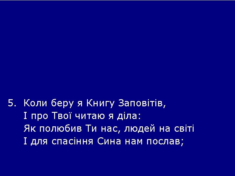 6. And when I think that God, His Son not sparing, Sent Him to die, I scarce can take it in; That on the cross my burden gladly bearing, He bled and died to take away my sin. 6. Як зрю Христа смиренного між людом, І думаю я про Його любов, Як Він прийняв за нас усіх наругу, І на хресті пролив невинну кров;