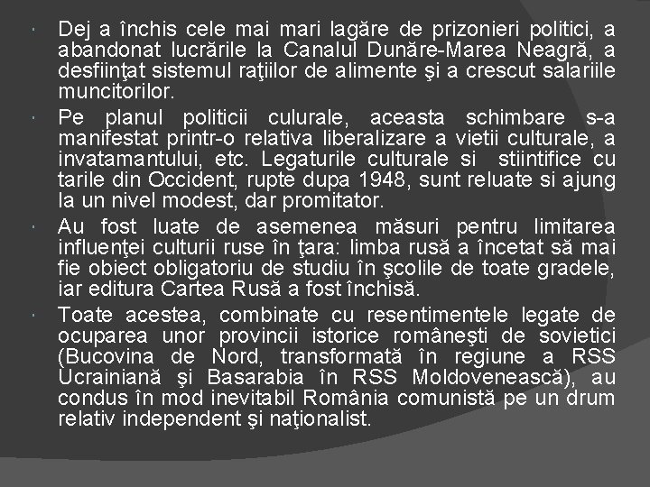 Dej a închis cele mai mari lagăre de prizonieri politici, a abandonat lucrările la Canalul Dunăre-Marea Neagră, a desfiinţat sistemul raţiilor de alimente şi a crescut salariile muncitorilor. Pe planul politicii culurale, aceasta schimbare s-a manifestat printr-o relativa liberalizare a vietii culturale, a invatamantului, etc. Legaturile culturale si stiintifice cu tarile din Occident, rupte dupa 1948, sunt reluate si ajung la un nivel modest, dar promitator. Au fost luate de asemenea măsuri pentru limitarea influenţei culturii ruse în ţara: limba rusă a încetat să mai fie obiect obligatoriu de studiu în şcolile de toate gradele, iar editura Cartea Rusă a fost închisă. Toate acestea, combinate cu resentimentele legate de ocuparea unor provincii istorice româneşti de sovietici (Bucovina de Nord, transformată în regiune a RSS Ucrainiană şi Basarabia în RSS Moldovenească), au condus în mod inevitabil România comunistă pe un drum relativ independent şi naţionalist.
