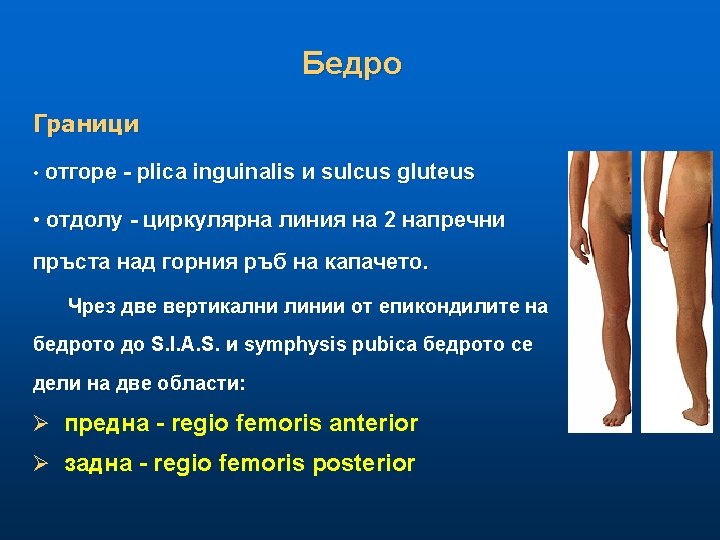 Области на долния крайник Седалище Regio glutea n Бедро Regio femoris anterior et posterior n Коляно Regio genus anterior et posterior n Подбедрица Regio cruris anterior et posterior n Ходило Regio calcanea Dorsum pedis Planta pedis n