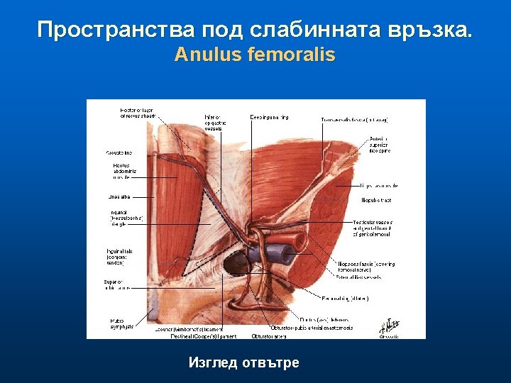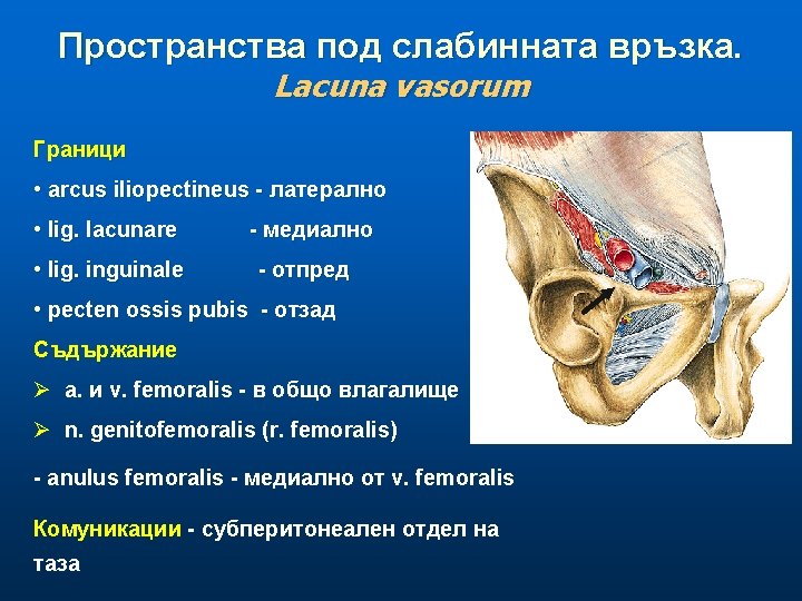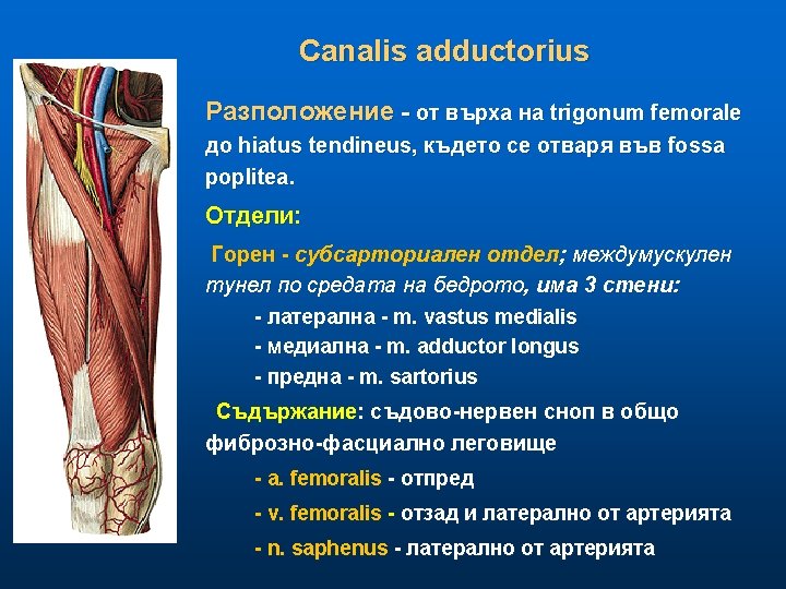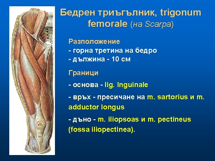 Бедрен триъгълник, trigonum femorale (на Scarpa) Съдържание - a. femoralis • повърхностни клонове • дълбоки клонове: - a profunda femoris (3 -5 см. под lig. inguinale) - a. circumflexa femoris med. et lateralis - v. femoralis (в общо влагалище) - v. saphena magna - vv. circumflexae femoris - v. profunda femoris - n. femoralis - моторни и сетивни за предна област на бедрото - n. saphenus