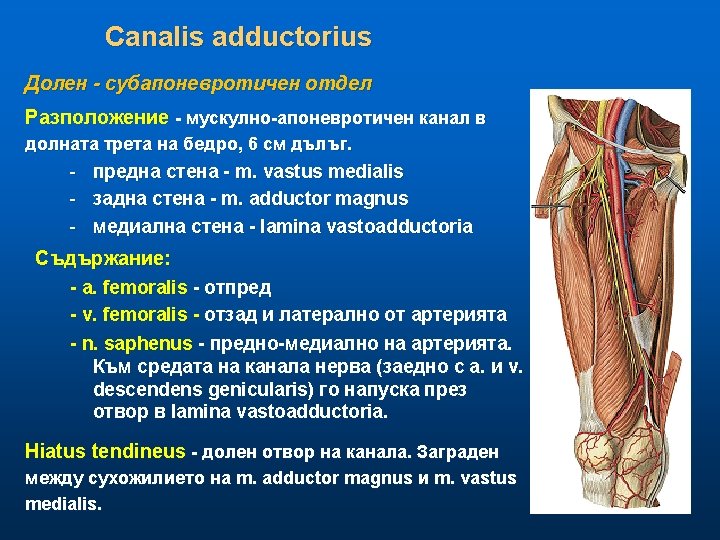 Canalis cruropopliteus Между: m. soleus, fascia cruris profunda и дълбокия пласт мускули Вход: • arcus tendineus m. solei • m. popliteus Изходи: - през membrana interossea - между m. tibialis post. и tendo Achilis Съдържание: a. и v. tibialis posterior Ø n. tibialis Ø