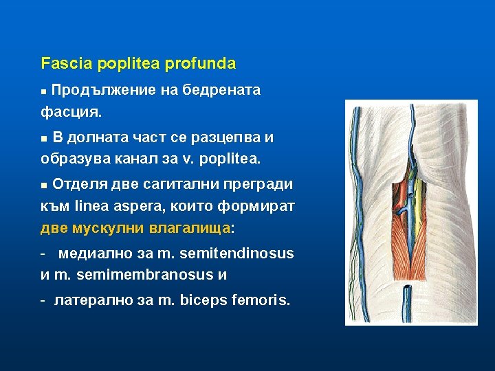 Fossa poplitea n n Кожа и фасции образуват покрива на fossa poplitea (задна стена). Fascia poplitea superficialis покрива • • • n n мастна тъкан, v. saphena parva, n. cutaneus femoris posterior, n. saphenus, n. cutaneus surae lateralis. V. saphena parva пробива fascia poplitea profunda и се влива във v. poplitea. Fascia poplitea profunda образува плътен фиброзен калъф за съдовонервния сноп.