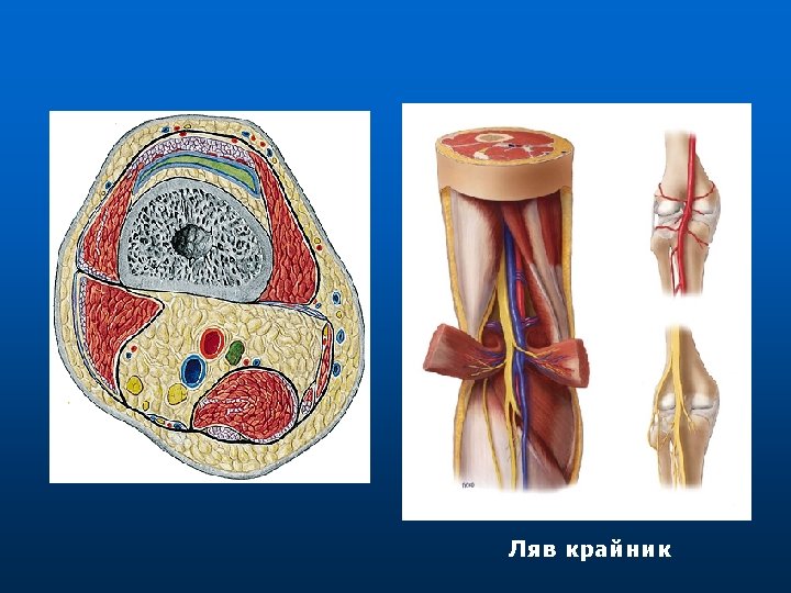 Предно леговище Между: tibia, membrana interossea, septum intermusculare anterius, fascia cruris. Съдържание: • m. tibialis anterior, • m. ext. hallucis longus, • m. ext. digitorum longus Ø n. peroneus profundus, Ø a. , v. tibialis anterior