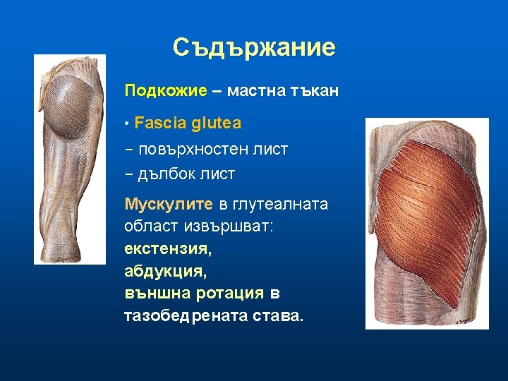 Мускули Разполагат се в 3 слоя: Ø M. gluteus maximus Ø n n Ø n M. gluteus medius M. piriformis Mm. gemelli M. obturatorius internus M. quadratus femoris M. gluteus minimus M. obturatorius externus