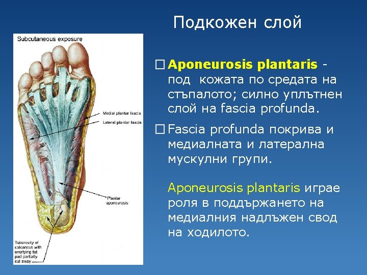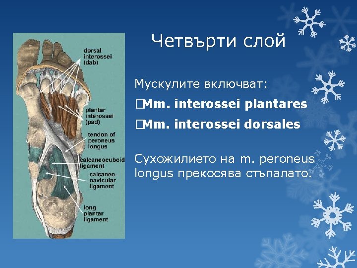 Втори слой Под m. flexor digitorum brevis: �M. quadratus plantae �Mm. lumbricales �Сухожилия на m. flexor digitorum longus, от които започват mm. lumbricales