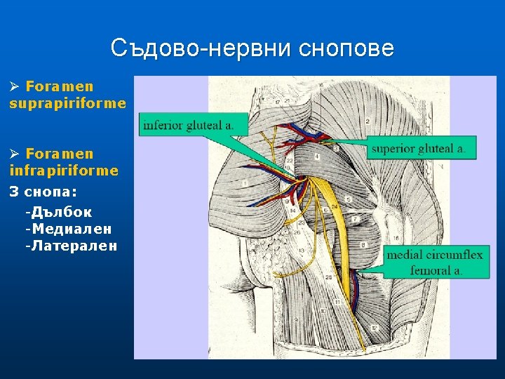 Нерви От plexus lumbosacralis: • N. gluteus superior (през foramen suprapiriforme). • N. gluteus inferior • N. ischiadicus • N. cutaneus femoris post. • N. pudendus Nn. за mm. gemellus inferior et superior, m. obturatorius internus, m. quadratus femoris. •