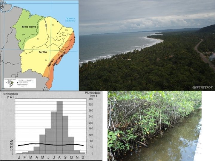 → Zona da Mata • Corresponde a porção litorânea e aos planaltos orientais do Nordeste; • Além dos planaltos litorâneos, também ocorre a presença de uma extensa planície costeira; • Presença de rios de pequena extensão e com elevada declividade (Bacias Agrupadas do Nordeste); • Clima predominante: tropical litorâneo (elevada umidade); • Vegetação original: Mata Atlântica e Mangue nas extremidades oceânicas.