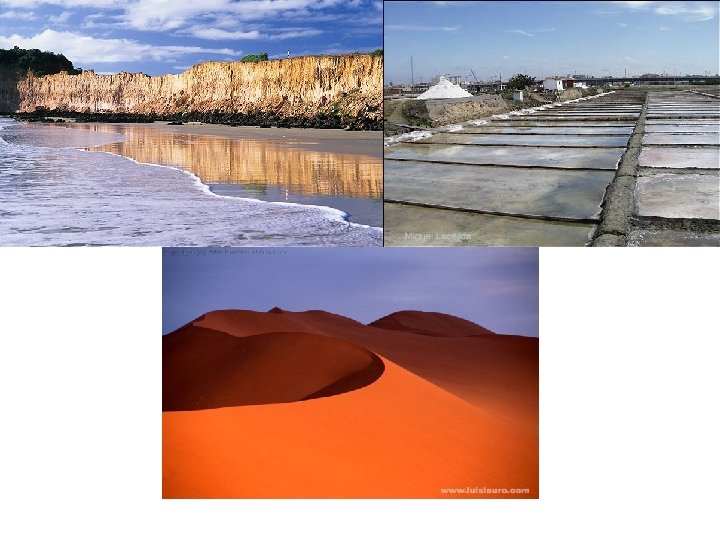 • Principal atividade econômica: pecuária ultra extensiva • Agricultura é encontrada nos “pés” e “altos” de Serra, devido à maior concentração de umidade; • Praticada de maneira extensiva, com predomínio de agricultura de subsistência; • Porção litorânea: presença de dunas que estendem por longas planícies sedimentares; • Falésias e restingas também são comuns na região; • Baixa umidade, elevadas temperatura e alta concentração de ventos favorecem a produção salineira no RN;