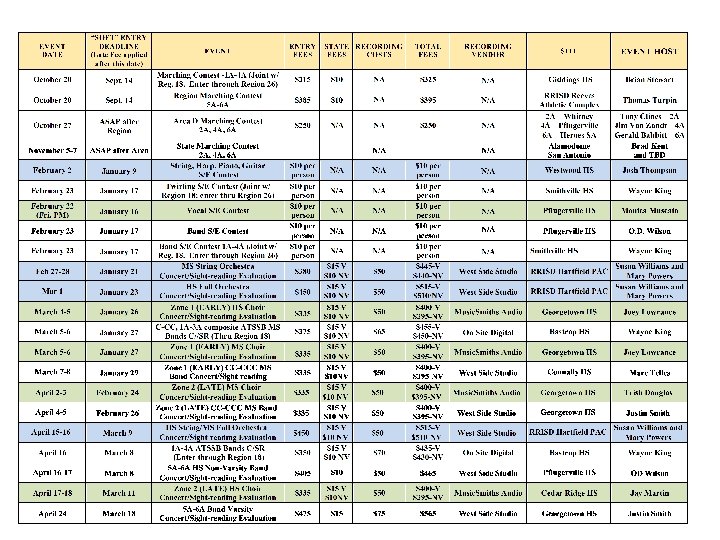 Region 26 Music Executive Committee: • Daniel Presley, Sr. Chief of Schools and Innovation, Round Rock ISD – Chair • Roger Dees, Superintendent, Giddings ISD – Vice-Chair • • • Fred Brent, Superintendent, Georgetown ISD Jodi Duron, Superintendent, Elgin ISD Celina Estrada Thomas, Superintendent, Hutto ISD Tommy Hooker, Superintendent, Thrall ISD Manuel Gamez, Director of Fine Arts, Pflugerville ISD Each of these administrators serve three-year terms on the committee, and they can serve multiple terms. When you see these people, THANK THEM for serving!!!