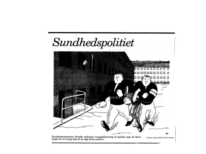 Historiske citater Betryggende retssikkerhed versus adækvat behandling. Hjalmar Helweg, professor i psykiatri v. Rigshospitalet : - ”det er vel et Spørgsmål, om man uden videre bør paalægge en fri Borger at lade sig helbrede, hvis han helst vil være fri” - en god lov, som ”i kortest mulig form skal sige, at de og de personer under de og de omstændigheder har lov til at berøve sindssyge deres personlige frihed og skal yde sikker hed for, at denne myndighed ikke udstrækkes for vidt eller misbruges” (1929)