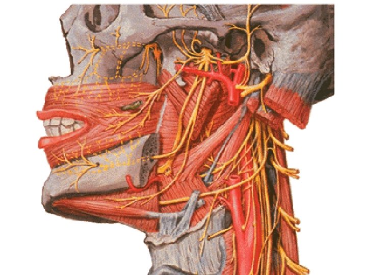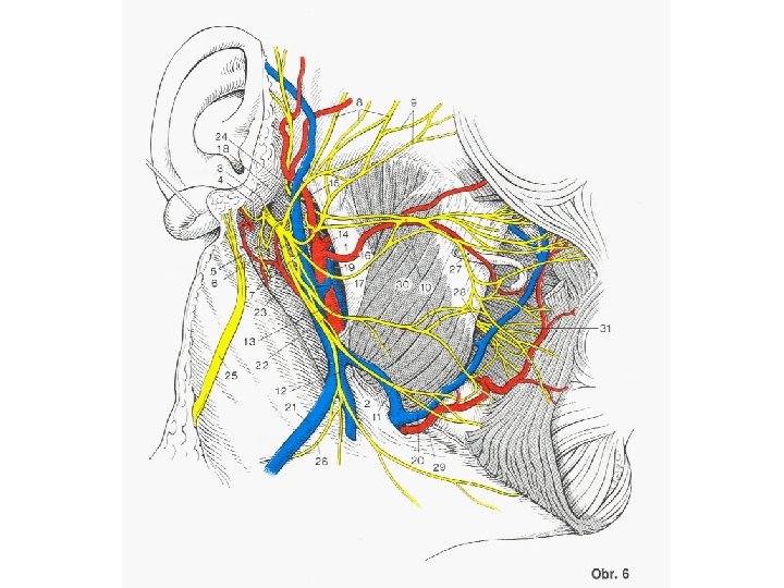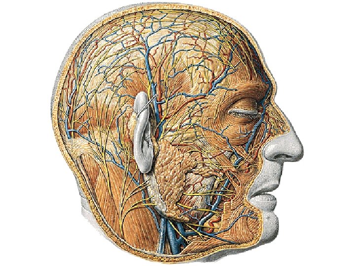 N. et vasa supraorbitalia N. et vasa supratrochlearia N. zygomaticotemporalis Vasa temporalia spf. N. auriculotemporalis Vasa auricularia post. Vasa occipitalia N. occipitalis major N. occipitalis minor N. occipitalis tertius N. auricularis magnus CN VII Nll. parotidei Nll. retroauriculares Nll. occipitales