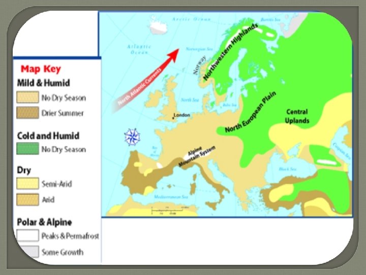 COOL TEMPERATE OCEANIC Climate • Where: Western Europe - From Northern Norway to North West Spain (including Ireland) • Temperatures: Summer average 15 - 17 (can go to 23) Degrees, lower averages along coasts, higher inland (South Westerlies=Trade winds / North Atlantic Drift=warm current). Winter average 4 - 5 Degrees - Moderating influences of S. Westerlies / North Atlantic Drift current. • Precipitation: all year round - Cyclonic and Relief Rainfall but with Winter Maximum 750 mm (Rain Shadow Dublin)- 2, 600 mm (West) • Effects: Positive (irrigation) and negative (leaching) effects of precipitation on soils