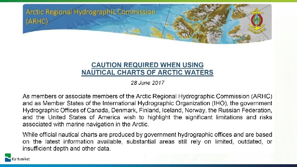 ARHC Achievements • ARHC acknowledged by Arctic Council WG PAME as the regional hydrographic authority. • ARHC engages across the Arctic community to communicate the hydrographic and charting data situation • • ARHC MS actively engage and contribute to many of the IHO WG’s. • ARHC drafted and published a note entitled, “Caution required when using nautical charts of Arctic waters”. • The newly established Arctic Regional Marine Spatial Data Infrastructure Working Group (ARMSDIWG) is engaging with Arctic SDI to improve access to marine geospatial information for Arctic marine and ocean areas. ARHC has made great strides to improve our understanding of the hydrographic data environment and communicate this situation to a broad community of users.