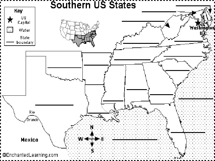 The South § A landscape of coastal plains, sandy & clay filled soil, pine, magnolia, oak, & cypress trees, & tropical zones. § A humid subtropical climate of long hot humid summers and mild winters. § Vacation spots such as Disney World, world famous beaches, French Quarter, historical battle sites from the Civil War, and the nation’s capital.