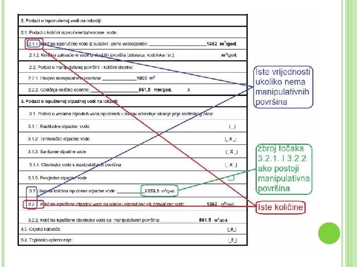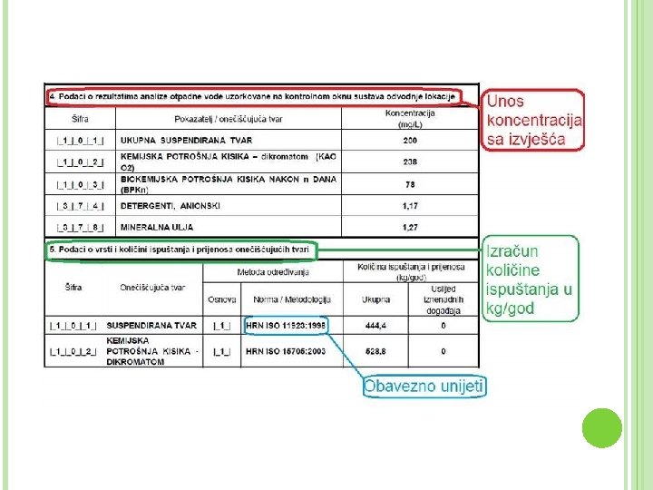 FORMULE ZA IZRAČUNE Proračun ispuštene vode s manipulativnih površina manipulativna površina – površina na kojoj se obavlja određena djelatnost Gdje je: Q – količina oborinske vode sa otvorenih manipulativnih površina upuštena u sustav odvodnje lokacije prije kontrolnoga okna (m 3/god) A – ukupna otvorena manipulativna površina (m 2) R – godišnja količina oborine (mm/god) Proračun ukupne emisije: Gdje je: E – količina emisija onečišćujućih tvari (kg/god) c – koncentracija onečišćujuće tvari (mg/L) po jednoj od osnova Q – količina ispuštene otpadne vode (m 3/god)