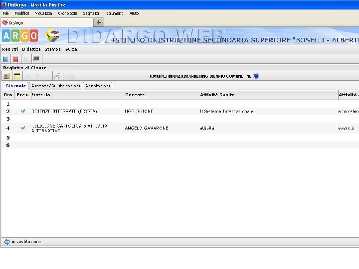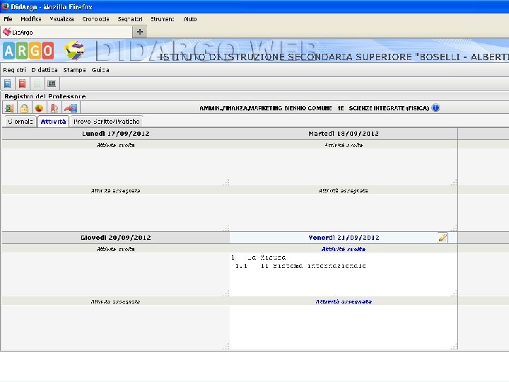 Firmare il registro • • Si apre il registro di classe (blu) Si seleziona la classe Si fa doppio clic sull’ora di lezione Si apre una finestra in cui si può inserire l’argomento della lezione (può essere importato dal programma) • Ed il compito assegnato • I compiti normalmente si segnano sul giorno per cui sono da fare