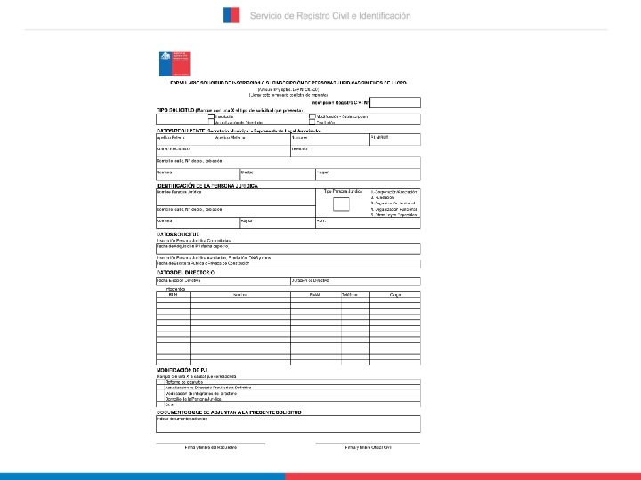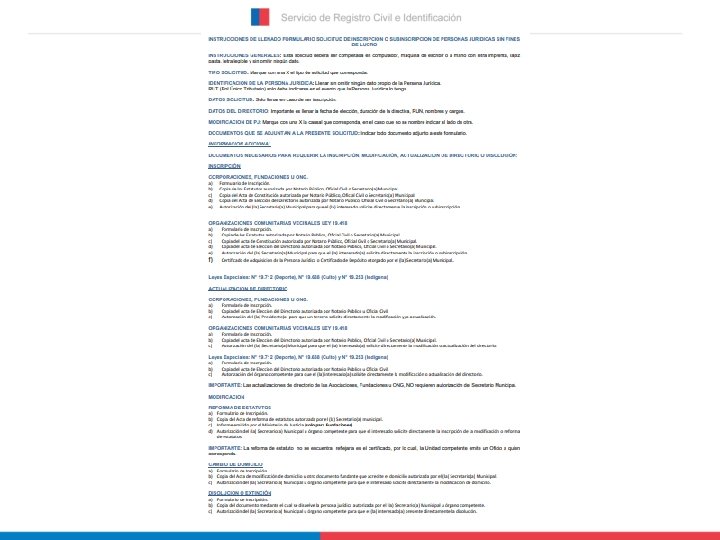 • LLENADO DEL FORMULARIO Remitir Formularios con todos los datos debidamente completados, incluyendo el N° de inscripción otorgado por el Servicio. No alterar el formato. Disponible en PDF modificable, gratuito, por pagina web. • Previo a remitir actualizaciones, se sugiere verificar que la organización se encuentre inscrita, mediante la planilla publicada en www. registrocivil. cl • Al no registrar inscrita, se deben adjuntar los documentos de constitución y el último directorio, mediante un solo Formulario, y marcar ambas opciones. • Verificar además, el último directorio registrado en este Servicio, mediante la emisión gratuita del certificado disponible en www. registrocivil. cl, a fin que sean remitidas las modificaciones que correspondan al directorio. • Verificar N° RUN de los miembros del directorio, con la respectiva cédula de identidad o certificado de antecedentes. • Verificar el domicilio registrado en el certificado, si es necesario actualizar, debe indicarse en el mismo Formulario. • El Registro se actualiza según lo que se requiera en el respectivo Formulario, y autorizado por la Secretaría Municipal.