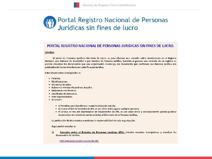 LEY 20. 500 • El Servicio de Registro Civil e Identificación tendrá a su cargo el Registro Nacional de Personas Jurídicas sin Fines de Lucro, cuyo objetivo será registrar y actualizar los antecedentes relativos a la constitución, modificación, disolución o extinción de las personas jurídicas. I. Aspectos Generales • Este Registro tendrá el carácter de electrónico y centralizado. • El Servicio certificará, a petición de cualquier interesado, la vigencia de las personas jurídicas registradas, así como la composición de sus órganos de dirección y administración.