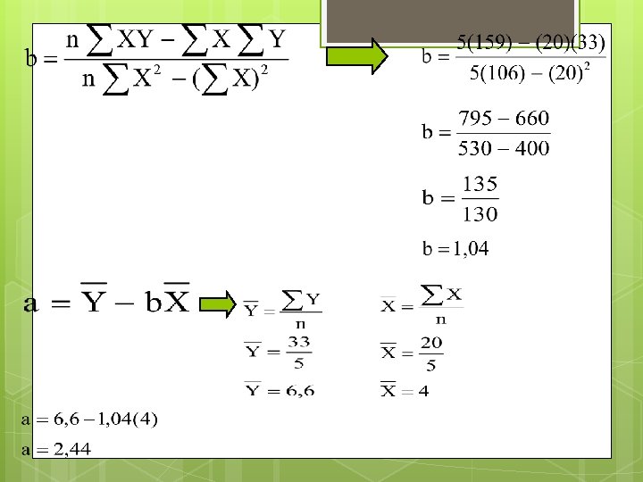 Y = variabel dependen (bergantung/dipengaruhi) X = variabel independen (bebas/mempengaruhi) n = jumlah observasi/pengukuran a = konstanta b = koefisien regresi