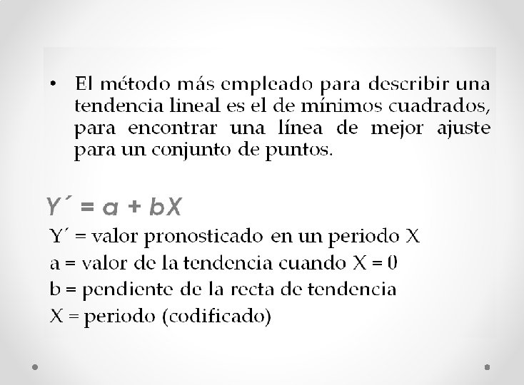 • El concepto de regresión lineal tiene como función primordial el determinar el grado en que se relacionan dos variables cualesquiera, las cuales se denominan variable independiente “x” y variable dependiente “y” mediante una técnica llamada mínimos cuadrados. • Dicha técnica se basa en encontrar la distancia mínima entre los puntos reales obtenidos de mediciones históricas y una recta estimada que represente todos los puntos.