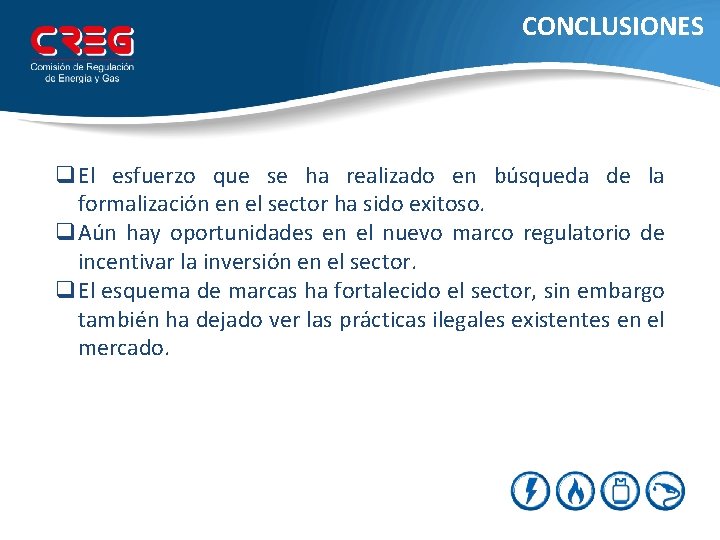 ACTIVIDADADES REGULADAS G + T + D + Cd En este momento la CREG se encuentra realizando un cambio regulatorio en todas las actividades de la cadena de prestación del servicio. Otras disposiciones: 1. Fortalecimiento del esquema de marca 2. Reglamento de transporte y comercialización mayorista 3. CU, D y T para el Archipiélago de San Andrés