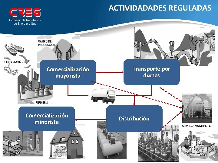 ACTIVIDADADES REGULADAS IMPORTACIÓN Comercialización mayorista Comercialización minorista Transporte por ductos Distribución ALMACENAMIENTO