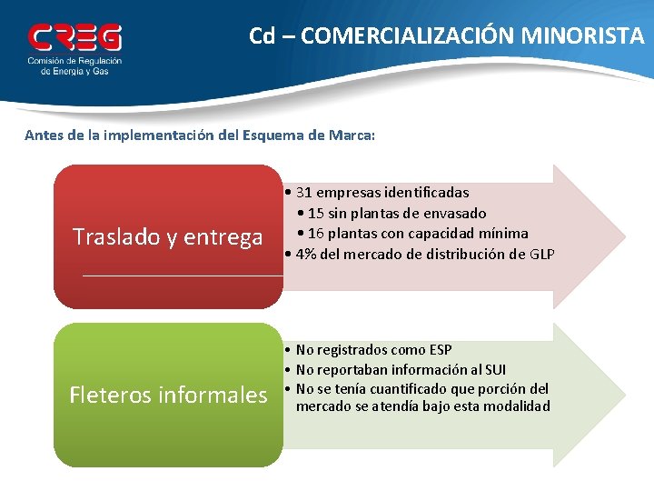 Cd – COMERCIALIZACIÓN MINORISTA Antes de la implementación del Esquema de Marca: Traslado y entrega Fleteros informales • 31 empresas identificadas • 15 sin plantas de envasado • 16 plantas con capacidad mínima • 4% del mercado de distribución de GLP • No registrados como ESP • No reportaban información al SUI • No se tenía cuantificado que porción del mercado se atendía bajo esta modalidad