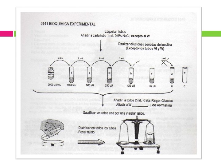 REACTIVOS para el experimento Estudien para que se usan c/u Solución Krebs-Ringer-Glucosa-Herpes (130 m. M Na. Cl, 5 m. M k. Cl, 1. 2 m. M KH 2 PO 4 , 2 m. M Mg. SO 4. 7 H 2 O, 10 m. M glucosa, 1 m. M Ca. Cl 2. 2 H 20 , 0. 2% BSA y 20 m. M HERPES p. H 7) 0. 9% Na. Cl Solución de insulina 2000 μU/ml. 4 μM de wormanina
