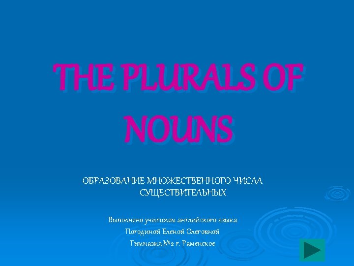 IRREGULAR PLURALS Some nouns form the plural by changing their vowel(s) : Man – men Woman – women Foot – feet Goose – geese Mouse – mice Tooth – teeth Louse – lice Ø A few nouns form the plural with – en : Child – children Ox – oxen Ø